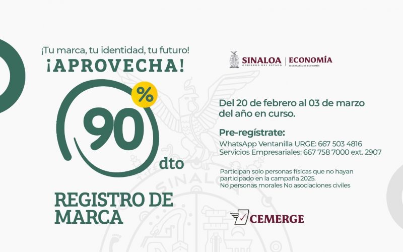 GOBIERNO DEL ESTADO Economía impulsa a emprendedores con 90% de descuento en el Registro de Marca febrero 20, 2026 Editorial