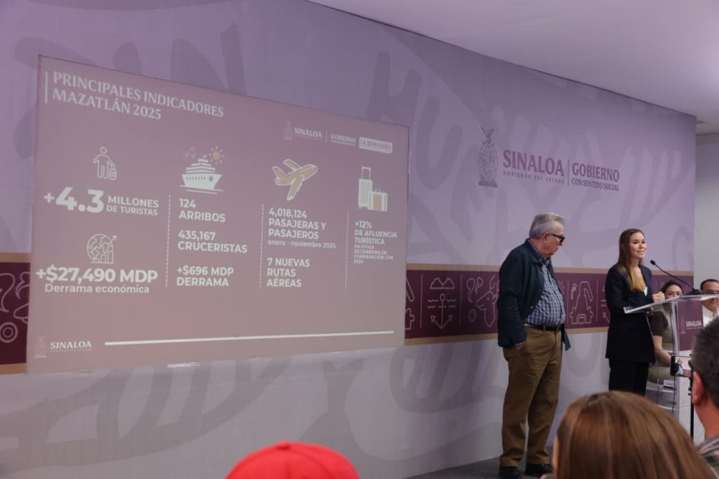 “En Mazatlán recibimos a más de 4.3 millones de turistas durante el 2025, con una derrama económica de 27,490 millones de pesos; además, le dimos la bienvenida a 124 cruceros, también en Mazatlán, donde recibimos a 435,167 cruceristas que dejaron una derrama económica de 696 millones de pesos”, señaló.