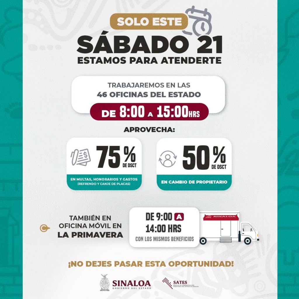 Culiacán, Sinaloa. Jueves 19 de marzo de 2026.- Con el objetivo de acercar y facilitar los servicios a las familias sinaloenses, el Servicio de Administración Tributaria del Estado de Sinaloa (SATES), por instrucción del Gobernador del Estado Rubén Rocha Moya, la Lic. Silvia Karina Gutiérrez Dautt, directora de Recaudación, informó que este sábado 21 de marzo se brindará atención en las 46 oficinas de recaudación en todo el estado, en un horario de 8:00 a 15:00 horas.